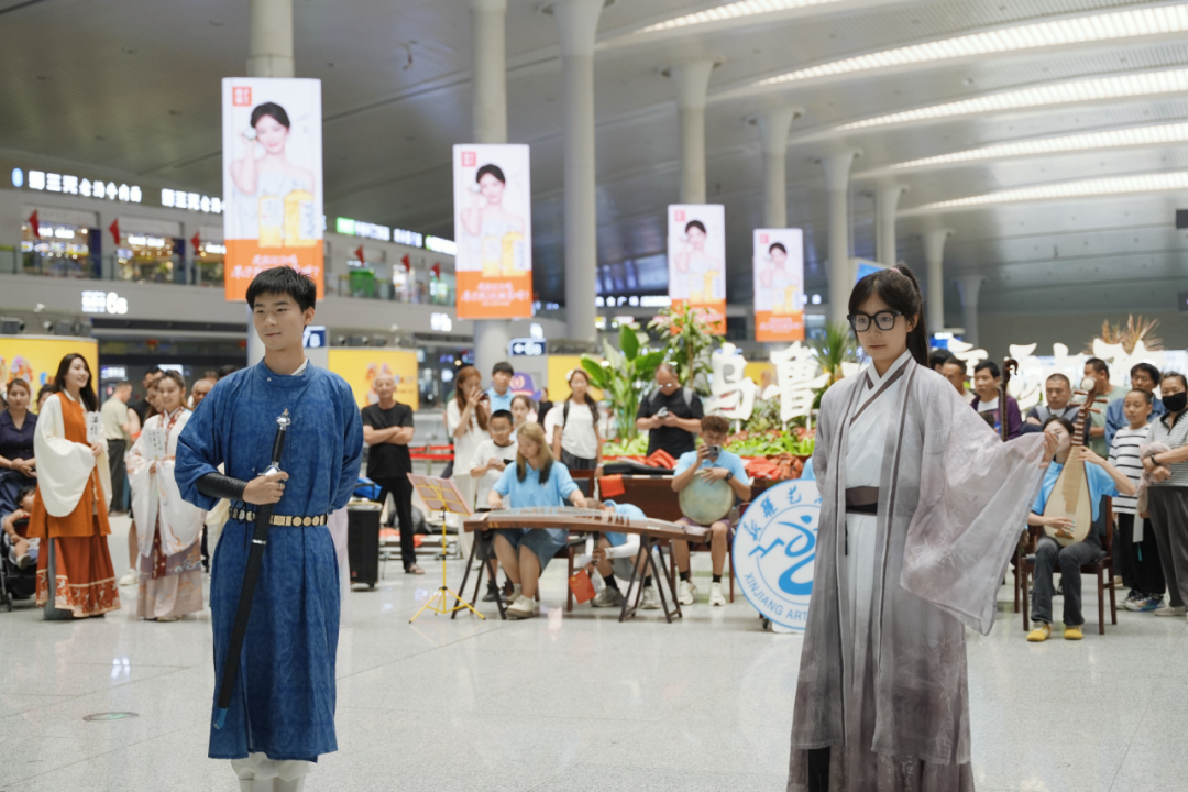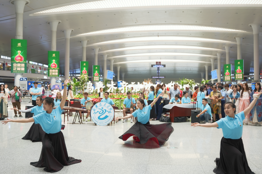 出发前,社会实践服务综合团队成员在乌鲁木齐高铁站进行了文艺表演。歌曲《我和我的祖国》,悠扬的旋律瞬间吸引众多旅客驻足,引发全场深情合唱;《民族舞串烧》与经典民歌《达坂城的姑娘》,欢快的节奏与优美的舞姿将现场气氛推向高潮;汉服走秀,展现了中华传统服饰之美;诗朗诵《祖国啊,我亲爱的祖国》,点燃现场人们的激情......活动现场,社会实践服务综合团队成员挥毫泼墨,为现场旅客和工作人员赠送精美的书法作品,传递美好祝福。