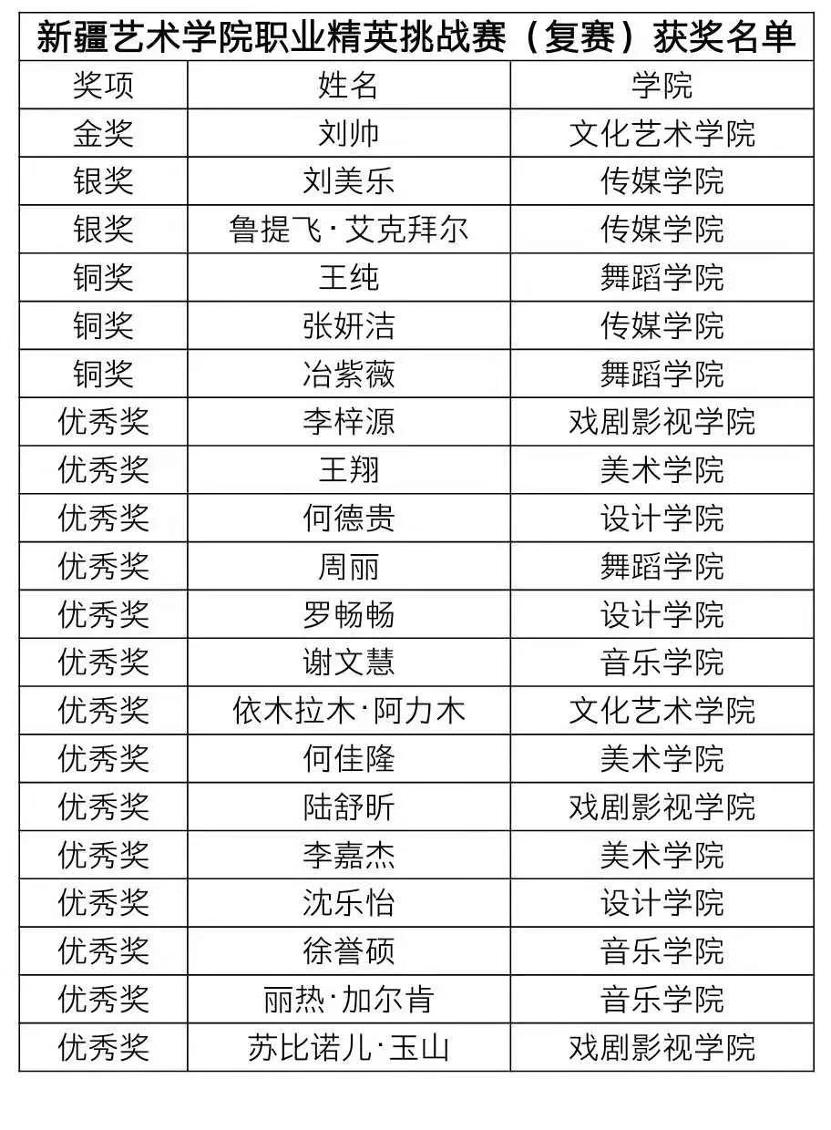 新疆艺术学院职场精英挑战赛圆满落下帷幕,获奖的同学将纳入新疆青少年发展中心就业人才库,并有机会获得晋级自治区比赛的资格,让我们一起向他们表示祝贺,希望他们能继续努力在后续比赛中有所突破,为校争光。