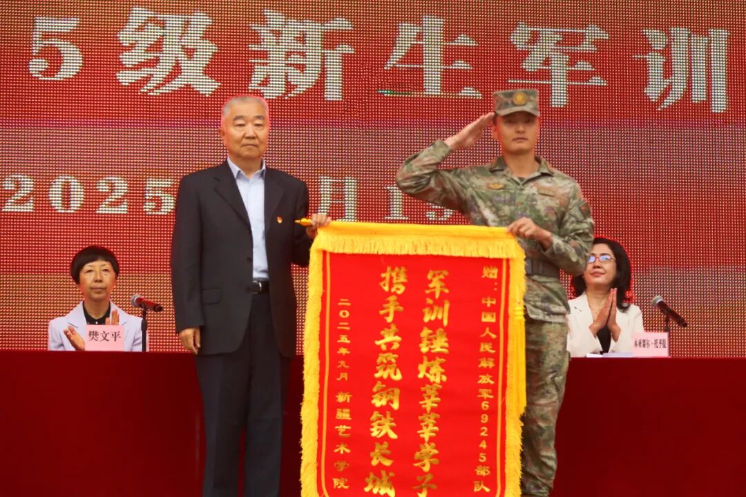 章立新书记向承训部队赠送锦旗。会上,学校党委常委、副院长全立新宣读了新疆艺术学院关于表彰2025级新生军训“先进集体”“优秀学员”的决定,校领导向受表彰学生颁发荣誉证书,学生代表作交流发言。